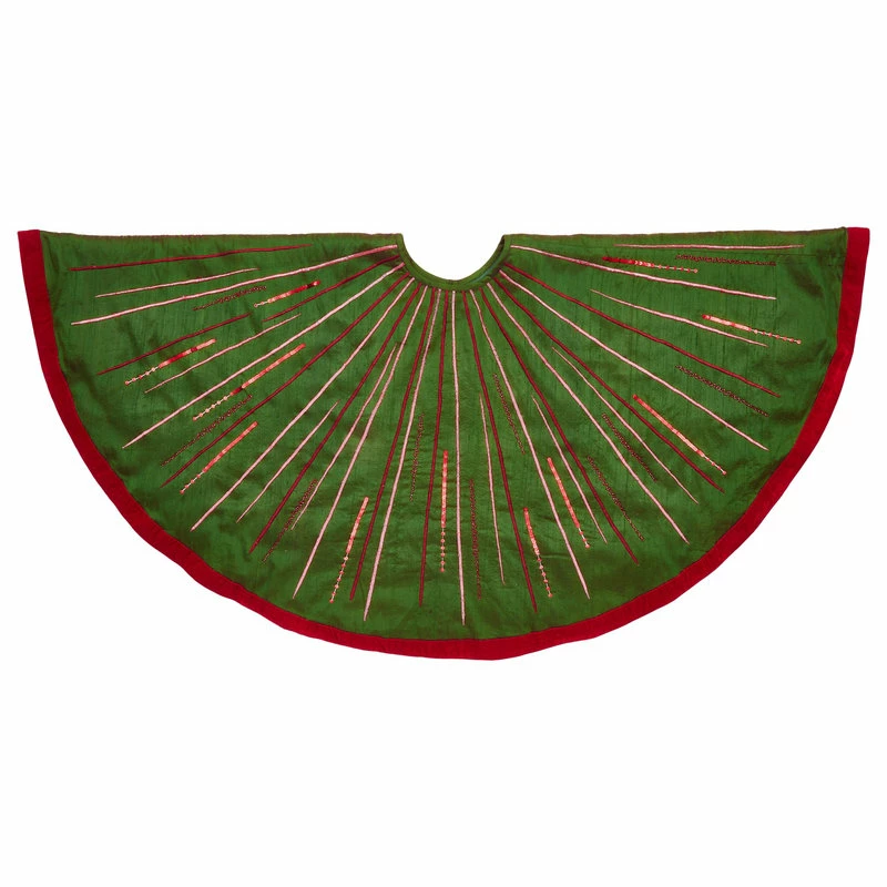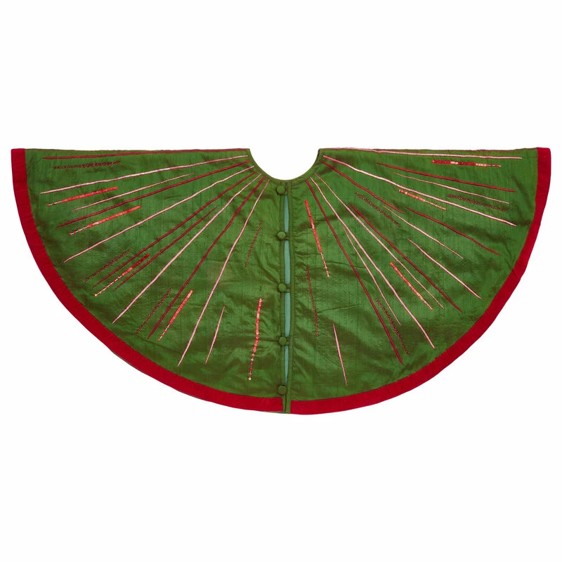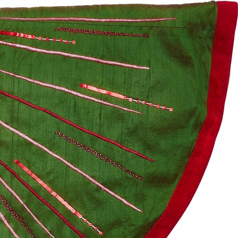 Crafted from exquisite green silk and adorned by hand with a hand-beaded starburst design and red velvet trim, this timeless Christmas tree skirt is a beautiful addition to your heirloom holiday decor.