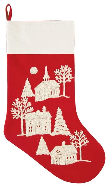 Spread holiday cheer in your home by decorating with our Peaceful Village, Church, House and Barn Red Holiday Stocking. Its embroidered design and classic red and cream hues contribute to its traditional appeal. Hang it from your fireplace mantle or on a door for a festive holiday display. You’ll look forward to decorating your home with it for Christmas year after year. You could also buy it and fill it with sweet treats as a truly thoughtful holiday gift for a co-worker, neighbor, friend or family member.. Measures 20 x 8 1/2 inches. Made of cotton with embroidered design, imported