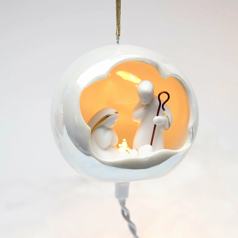 Decorate your Christmas tree with the Holy Family North Star Ornament. Made from hand-painted ceramic, this white nativity scene ornament is elegant and unique. Insert a Christmas tree light into the bottom of the ornament to create a warm glow.