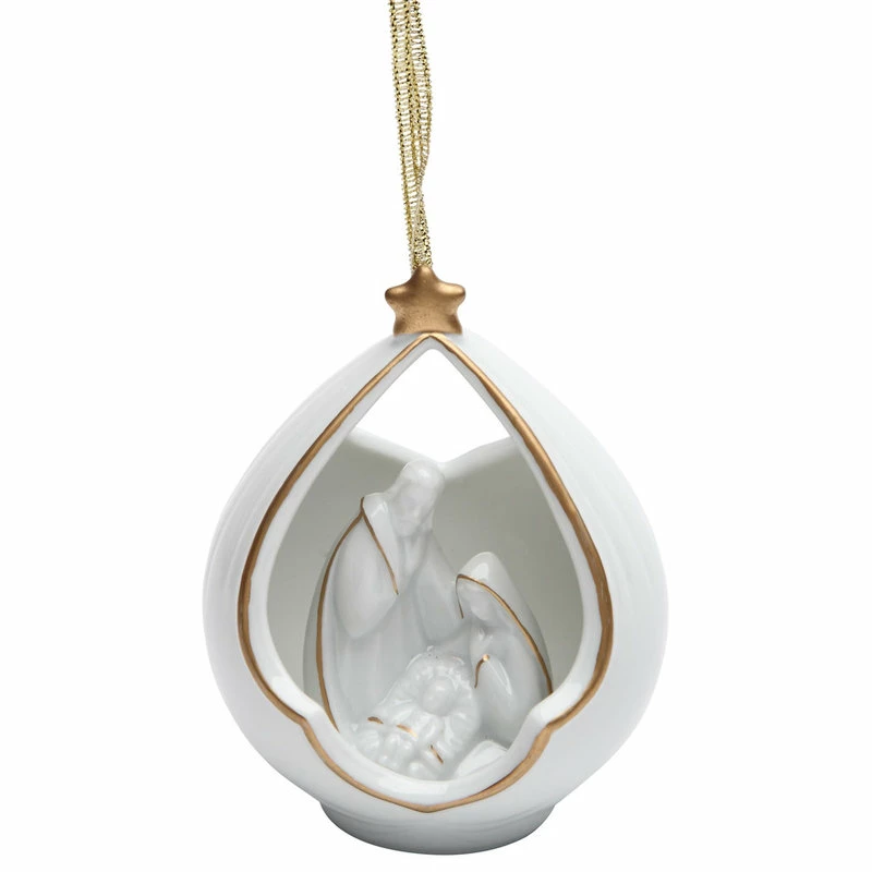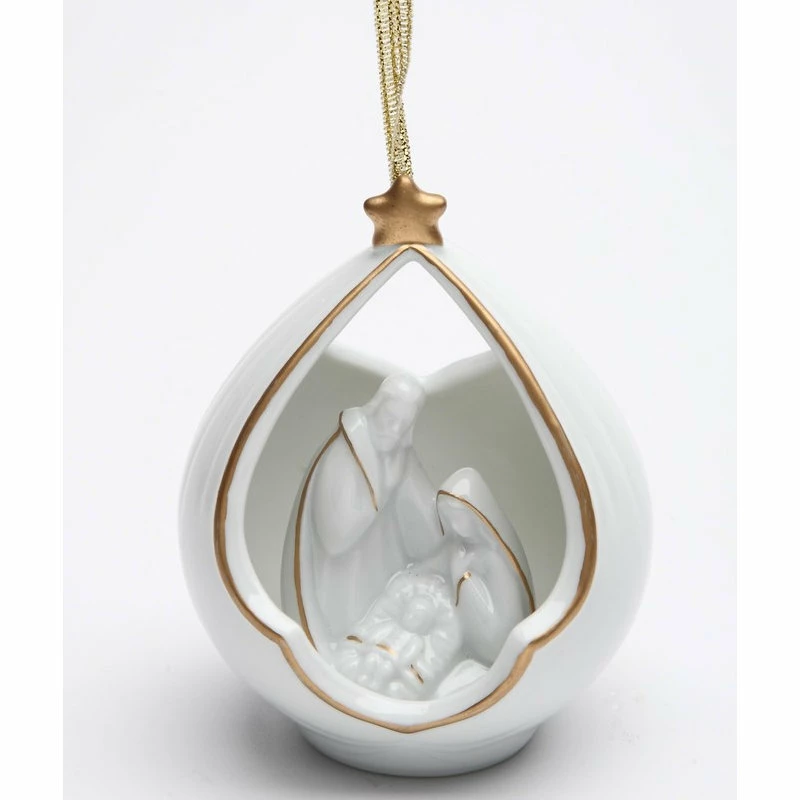 Decorate your Christmas tree with the Nativity Ornament. Featuring the holy family crouched together, this white ceramic globe ornament is elegant and reverent. Insert a Christmas tree light into the bottom of the ornament to create a soft translucent glow.