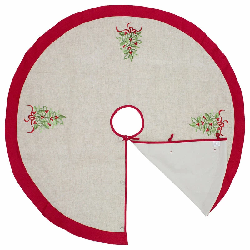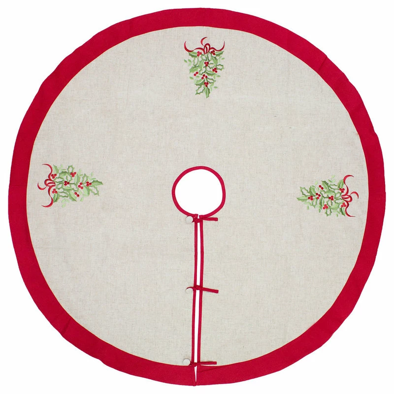 Create the perfect foundation for your Christmas tree with this stylish skirt featuring a traditional embroidered design and solid color border. Opening with buttons closure.