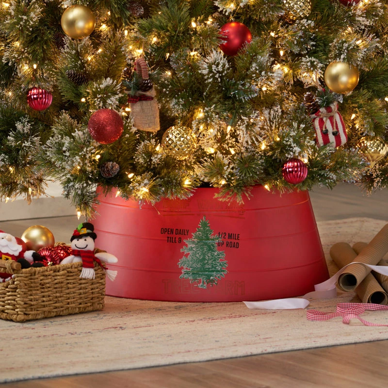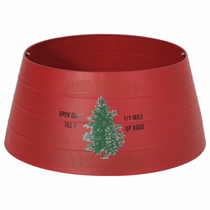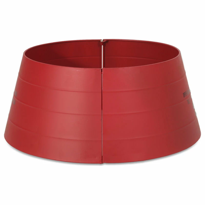- IRON: Constructed of iron, this tree collar offers a traditional look to any Christmas tree. Refined with a matte red finish and handcrafted look, this accessory brings a dash of holiday cheer to any home.