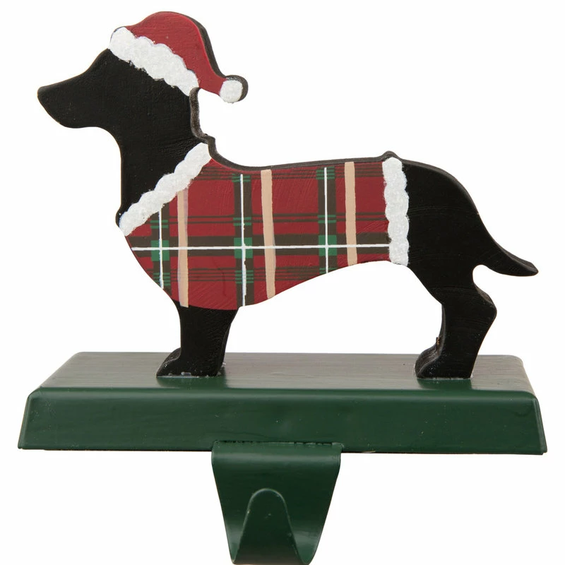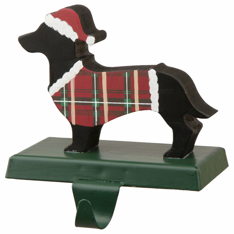 5.92″”H Wooden and Metal Dachshund Stocking Holder,,a standing Dachshund in a plaid clothes and a red Santa hat,It’s very cute,and sure to add the perfect finishing touch to your mantel display!
