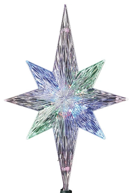 This Kurt Adler 11.25″ Polar Star Treetop is a colorful, fun way to top your Christmas tree and accent its lighting. This 8-pointed star is color changing, changing from such colors as blue, green and red. This tree topper comes with an LED color-changing light, a 12-inch lead wire, and a 4.5V DC 200MA AC adaptor.