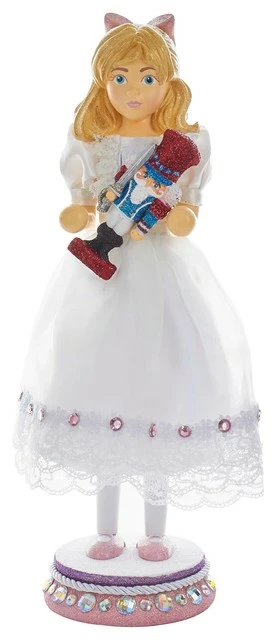 Hollywood Nutcrackers is a whimsical collection of nutcrackers created exclusively for Kurt S. Adler, Inc. and features an assortment of designs that put a unique, vibrant, memorable twist on traditional nutcrackers. This 15-Inch Hollywood Clara Nutcracker from Kurt Adler is a fun and festive addition to any holiday decor or nutcracker collection. Featuring Clara from the Nutcracker, this piece is wearing a lovely white dress with pink embellishments around the skirt. She is holding her own miniature Nutcracker Prince, and stands on a pink bejeweled base.