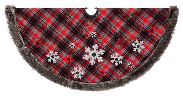 Add the perfect finishing touch to your Christmas tree with this 48-inch Plaid Snowflake Design Tree Skirt from Kurt Adler. Its red and black plaid design is accented with white snowflake appliques for a festive touch.