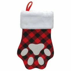 Celebrate your fur buddy this season with this super fun Christmas stocking. Perfect for a cat or dog with a white embroidered paw print over a buffalo plaid base shaped just like a paw print. Treat your pets to some awesome stocking stuffers this Christmas. Product Features: