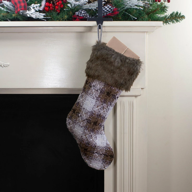 Add a rustic and cozy touch to your holiday decor with this plaid stocking. The brown and black design with brown faux-fur trim will make this stocking standout. Just perfect to hang from your mantels. Product Features: