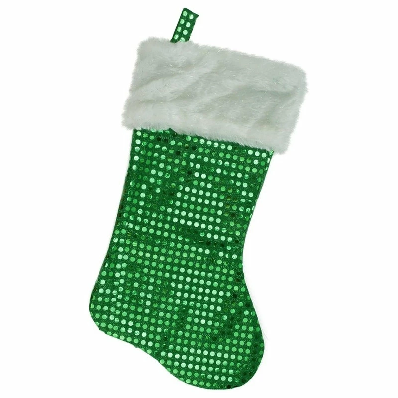 - Stocking features disco ball like embellished fabric with iridescent fiber accented faux-fur cuff