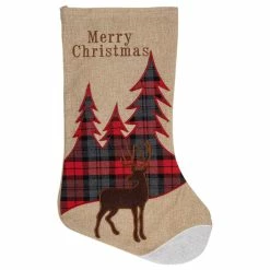 Add a touch of the outdoors to your holiday decor with this Christmas stocking. The stocking is burlap beige with 3 plaid patterned forest trees while a brown reindeer stands Infront in a hill of snow all while reading “Welcome” perfect outdoor scene. You can hang this stocking on your mantel staircase or even on the doors of your home. Features: