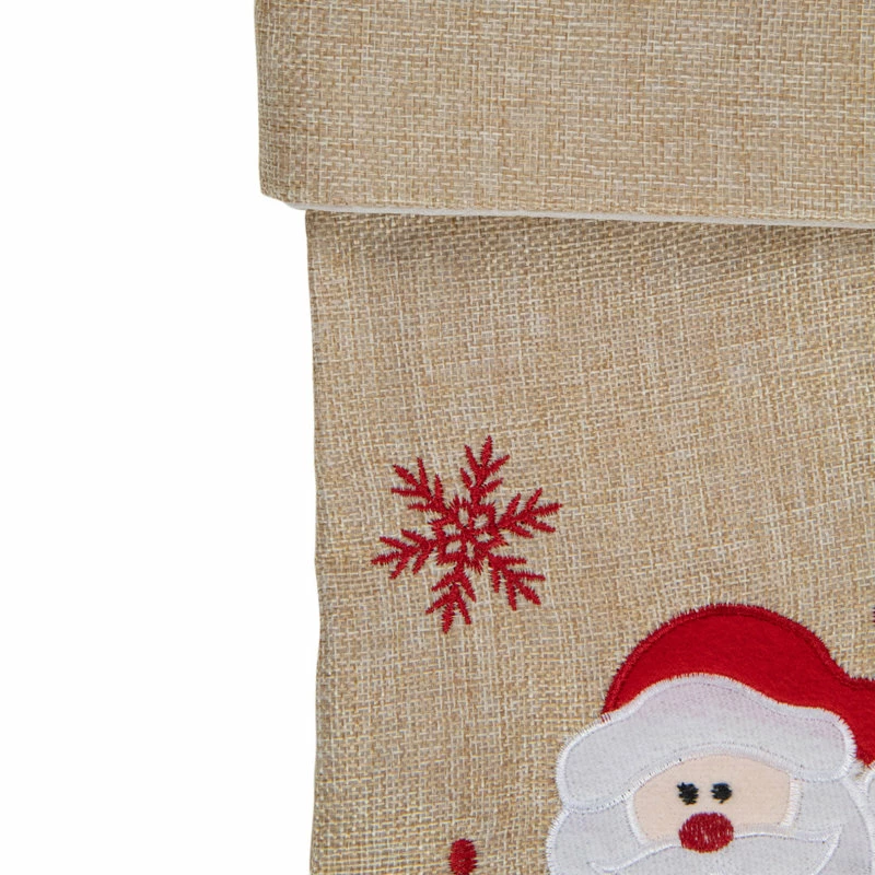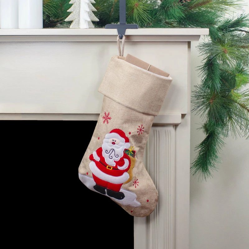 There’s nothing more festive than the thought of stockings hanging on the fireplace on Christmas Eve filled with treats to be enjoyed on Christmas morning. This stocking is burlap features Santa Claus standing on a bed of snow carrying his present sac over his shoulder surrounded by polka dots and snowflakes while dressed in his traditional suite for all the little girls and boys to see. You can hang this stocking on your mantel stairwell or even your child’s bedrails. Features: