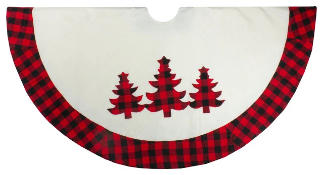 Bring your Christmas tree into a focal point of attention with this white tree skirt with red and black buffalo plaid trees and trim. This skirt creates a cheerful statement to your holiday tree enhancing its overall appeal. Never miss out on such a fascinating article that you will cherish for years to come. Product Features: