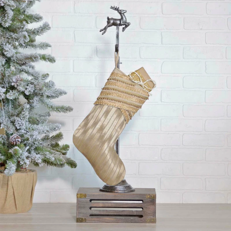 - Holiday Decor – Rich in elegance, this khaki stocking features a layered chambray cuff dressed with golden ball trim and lace. Hang with care on the fireplace mantel or stairwell to bring a touch of shimmer into your home for the holidays.